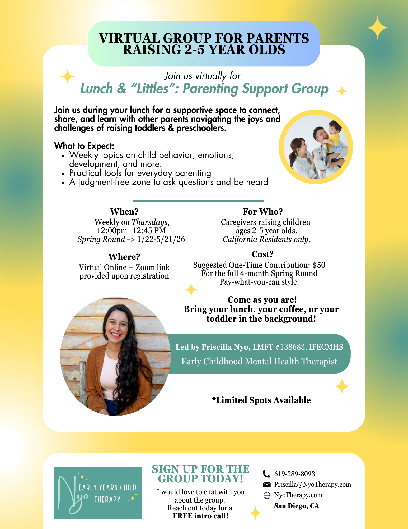 Join us during your lunch for a supportive space to connect, share, and learn with other parents navigating the joys and challenges of raising toddlers & preschoolers.